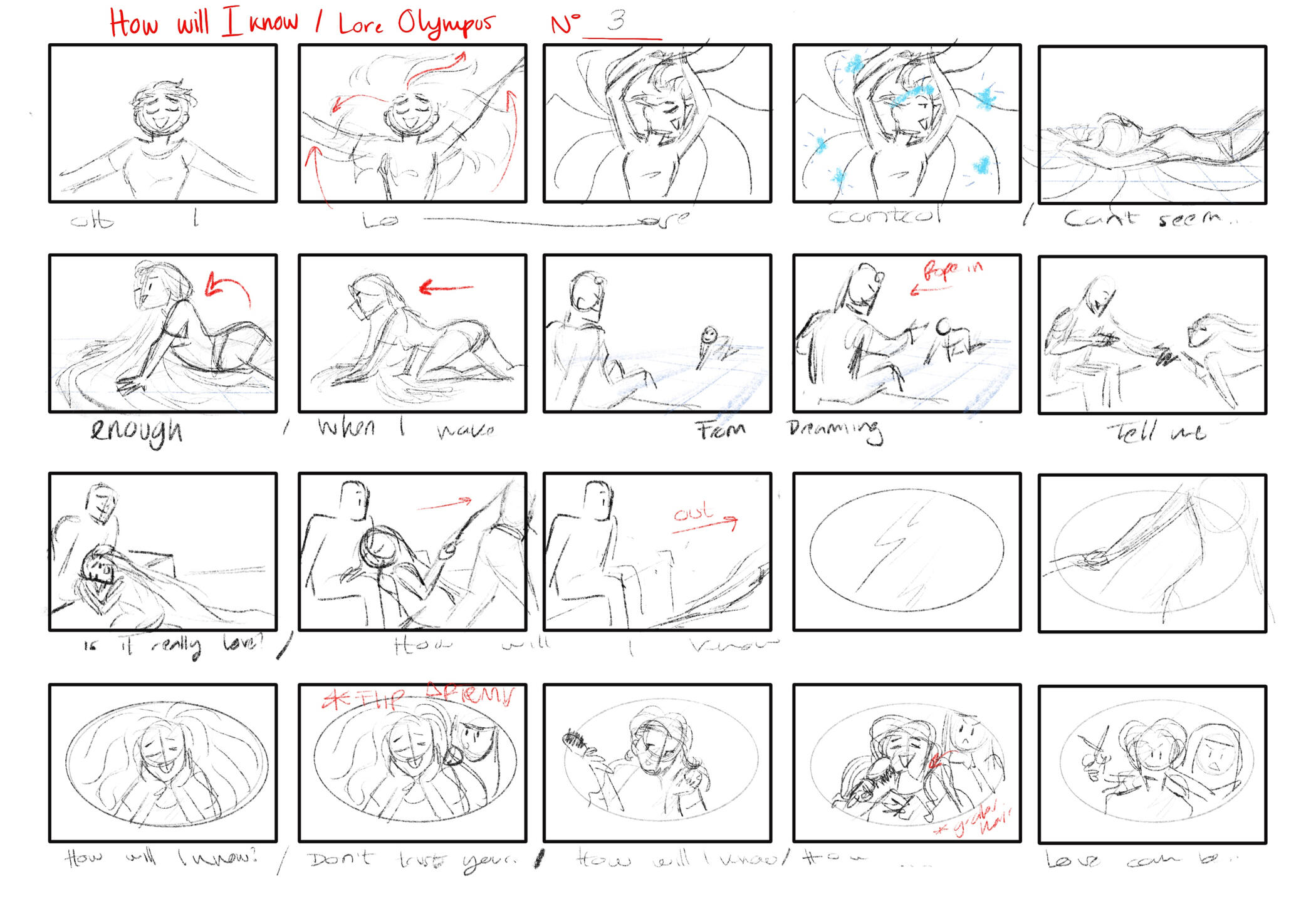 Thumbnails and first version of animatic for personal WIP based on Rachel Smythe's Webtoon characters